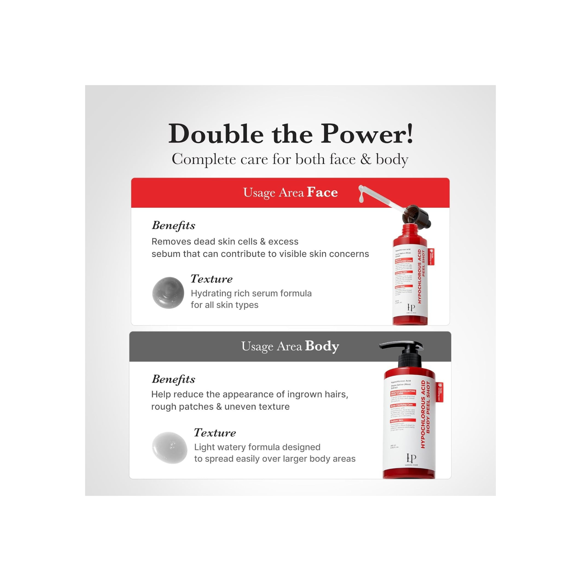 A gentle body exfoliating peel that smooths rough texture, helps unclog pores, and refreshes dull skin. Designed to improve the appearance of ingrown hairs, congestion, and uneven tone — without harsh abrasion.